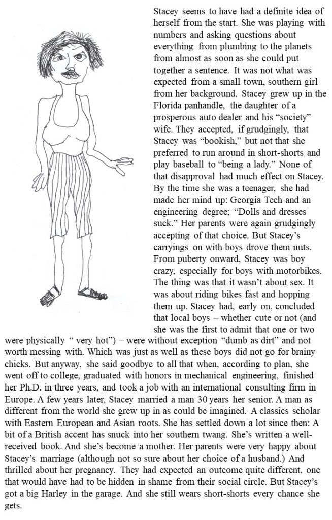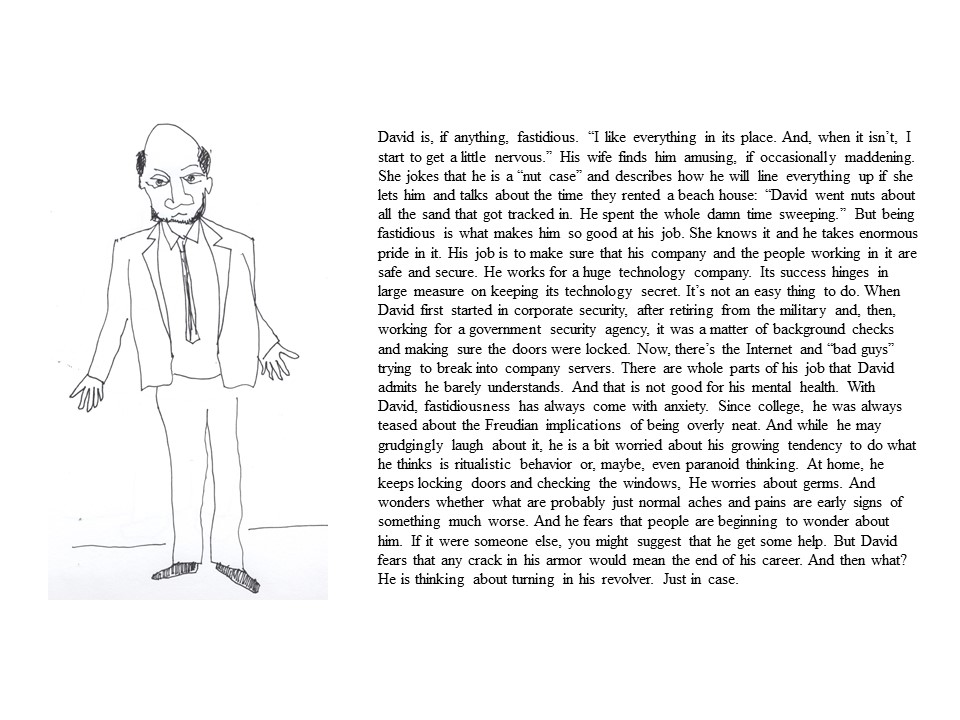 I am an artist and illustrator. And these “episodes” are quick sketches of and stories about people that I meet or have met over the years. I do the drawings first, keeping them simple and spontaneous but (hopefully) sophisticated. They are with perhaps one or two exceptions, line drawings done with a fine-line pen. I started doing these drawings in business meetings. That expanded to doing them in waiting rooms or while traveling, as a way to remember the people I met, worked with, or just observed from afar. Once I’d done a number of these sketches, I began to wonder about the people they depict. What might they be really like on the inside? What are their dreams? Their fears? Their secrets? Since I did not know the people I was drawing (or because I did not know them well), I felt ill-at-ease about asking personal questions. And so, I began to create stories about these people, based on what I imagine their life is like. That way, each drawing became a kind of psychological adventure; I never knew, when I sat down to write, what I was going to find. Like the drawings themselves, the stories are not to scale or photographic. If there is any prevailing theme, it is this: people keep their inner world well-hidden and probably for damn good reason. A secondary theme: making stuff up is much more fun than reality. And in a way, that is the real truth in all this. If you would like to learn more about me or my work please send a note. Our email: myron.gilbert@att.net