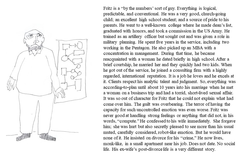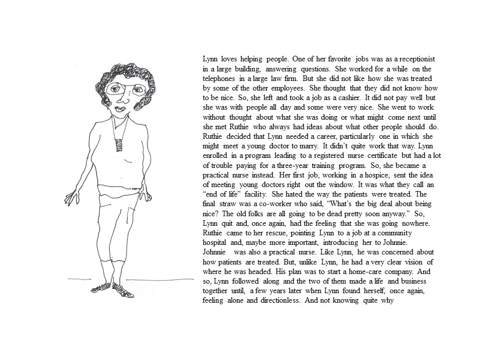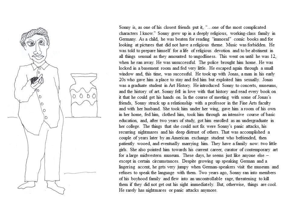 I am an artist and illustrator. And these “episodes” are quick sketches of and stories about people that I meet or have met over the years. I do the drawings first, keeping them simple and spontaneous but (hopefully) sophisticated. They are with perhaps one or two exceptions, line drawings done with a fine-line pen. I started doing these drawings in business meetings. That expanded to doing them in waiting rooms or while traveling, as a way to remember the people I met, worked with, or just observed from afar. Once I’d done a number of these sketches, I began to wonder about the people they depict. What might they be really like on the inside? What are their dreams? Their fears? Their secrets? Since I did not know the people I was drawing (or because I did not know them well), I felt ill-at-ease about asking personal questions. And so, I began to create stories about these people, based on what I imagine their life is like. That way, each drawing became a kind of psychological adventure; I never knew, when I sat down to write, what I was going to find. Like the drawings themselves, the stories are not to scale or photographic. If there is any prevailing theme, it is this: people keep their inner world well-hidden and probably for damn good reason. A secondary theme: making stuff up is much more fun than reality. And in a way, that is the real truth in all this. If you would like to learn more about me or my work please send a note. Our email: myron.gilbert@att.net